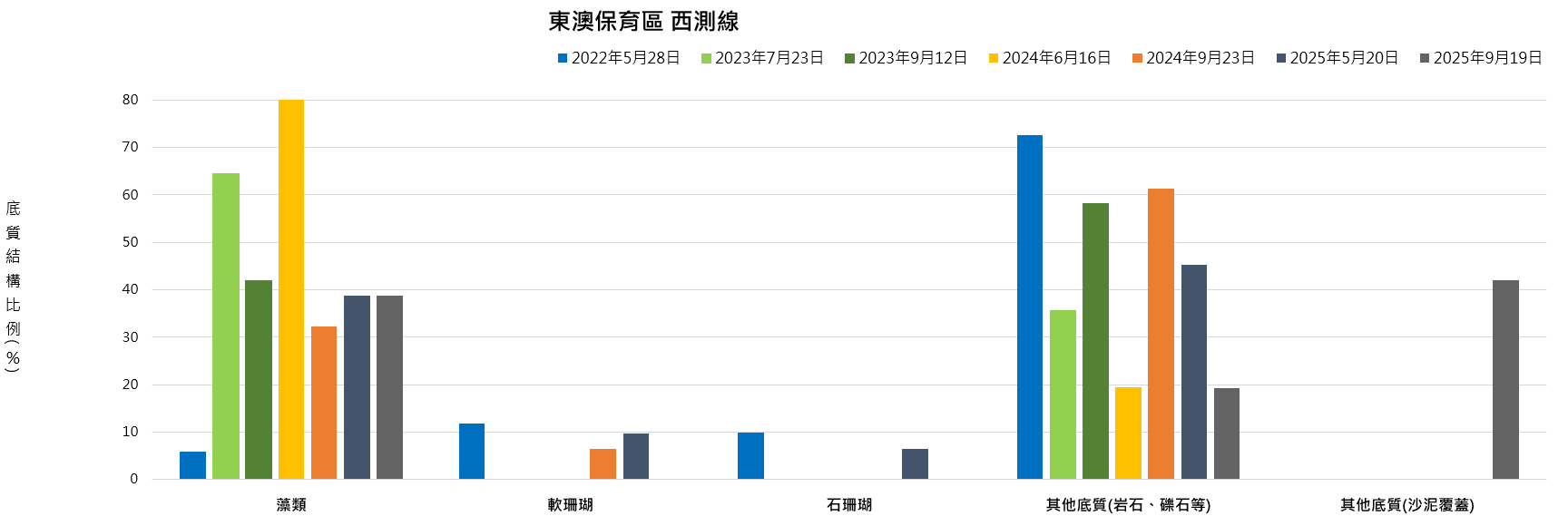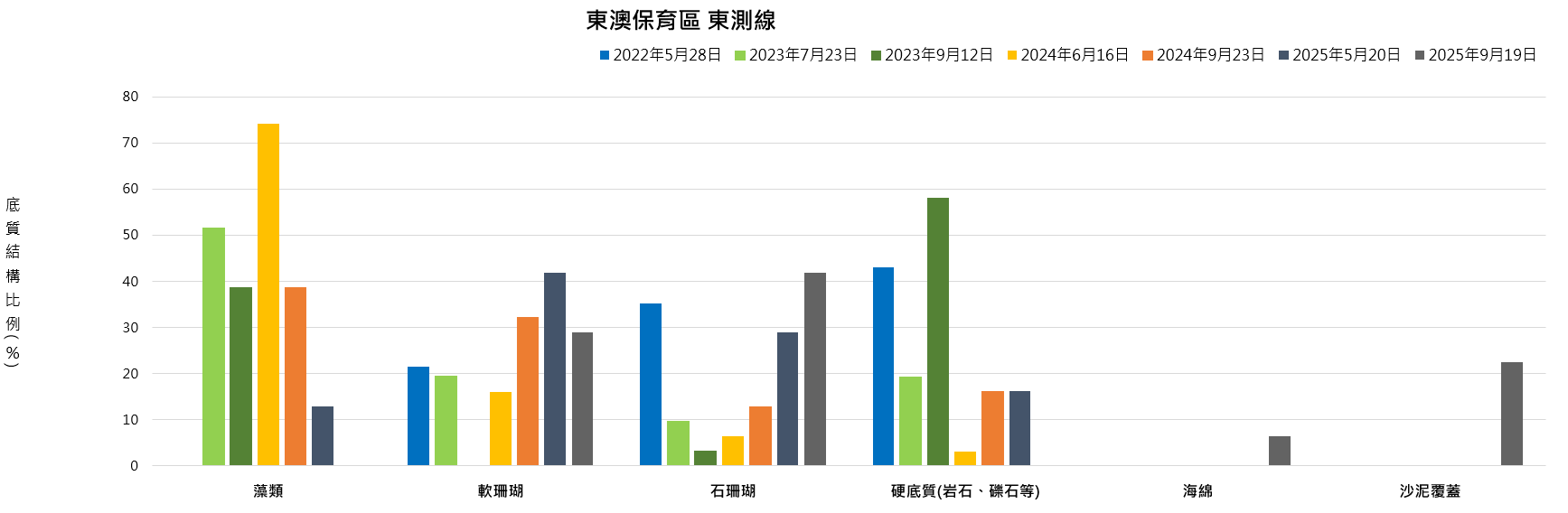 核心區由岸際向東北東方向的(1)西測線、(2)東側線。並綜整2022至2025年東澳保育區水下調查結果。